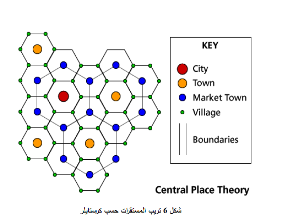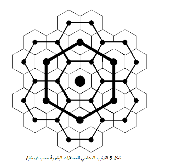 وبناءا على ذلك وفي حالة وجود إقليم جغرافي تتوزع فيه الخصائص الطبيعية بشكل متجانس من حيث الطبوغرافية والتربة والمناخ والموارد المائية وبدون أن يكون هناك عقبات طبيعية تعيق الحركة فيه ، كذلك التجانس في التوزيع الجغرافي للسكان ، وبناءا على هذا الافتراض توصل إلى أن هناك تسلسل هرمي متدرج لمستوى النشاطات الخدمية يتناسب مع الحجم السكاني للمستقرات البشرية في الإقليم، كما انه افترض أن لكل مستوى من مستويات المراكز للمستقرات إقليم يتسع بدرجة تتناسب مع الحجم السكاني ومستوى الخدمات التي يقدمها هذا الإقليم ، ويتخذ الشكل السداسي والذي افترضه في بداية الأمر أنه شكل دائري ولكنة وجد أن في الشكل الدائري يترك مناطق ضل متداخلة بين الأقاليم أو انطقه التأثير ، كما أنه توصل إلى أن كل مركز خدمي يقدم الخدمات إلى ستة مراكز من المرتبة التي تليه من حيث الأهمية وهكذا يستمر الشكل النهائي للتوزيع الجغرافي لمراكز الاستقرار البشري في الإقليم بترا تب سداسي متدرج ومنتظم .