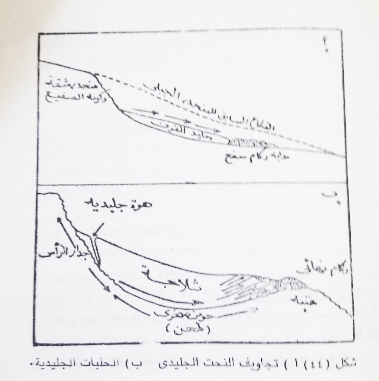 وتحتاج تجاويف فعل التجمد والذوبان هذه Nivation Flollows الوصول الى حجم وعمق كبيرين نوعا قبل المراحل النهائية لتكوين الثلاجة الحلبية Cirque Glacier وفي بعض الاحيان تبدو هذه التجاويف مماثلة للحلبات الحقيقية، اذ تتميز بجدران عن رأسها شديدة الانحدار، قد مزقها الصقيع، ذات علو يتراوح بين 35- 70متراز وقد تنزلق المواقد المتحللة عبر جليد الفيرن، وتتراكم عند أسفله مكونة لأكوام من الحطام تشبه الركام، او ما يمكن تسميته بركام سفح صغير (شكل 44أ). وتمكن رؤية تجاويف فعل التجمد والذوبان في مراحلها النهائية مقتربة جدا من أشكال الحلبات الحقيقية في أعالي منحدرات وادي الرون بسويسرا.