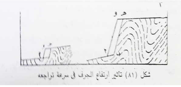 ولارتفاع الجروف أثره الكبير في درجة تآكلها وتراجعها نحو اليابس، فالجروف القليلة الارتفاع تتراجع بسرعة تفوق سرعة تراجع الجروف الاكثر منها ارتفاعا، هذا إذا تساوت وتماثلت معدلات التعرية البحرية وطبيعة الجروف وتركيبها الصخري. ذلك أنه يحث تحدث التعرية البحرية قطعا معلوما في الجرف فإن كمية مواده التي تنهار على الشاطئ لا بد وأن تتناسب مع ارتفاع الجرف، ففي الشكل (81) نجد أن كمية الحطام الصخري التي تتساقط مع قطع الجرف أ ب جـ د لا بد وأن تكون أقل حجما من كمية المواد التي تنهار من قطع الجرف أ ب هـ و (وهو الجرف المرتفع). ويتراكم الحطام الصخري المهار عند حضيض الجرف فيحميه من فعل البحر ولكي تمارس التعرية البحرية عملها في حضيض الجرف من جديد لابد لها أن تفتت الحطام الصخري الذي انهار وتحوله الى حبيبات ذات أحجام معينة تستطيع تحريكها وازاحتها من حضيض الجرف. ولاشك أنها تنجز عملها هذا في حالة الجرف المرتفع في زمن أطول منه في حالة الجرف المنخفض.