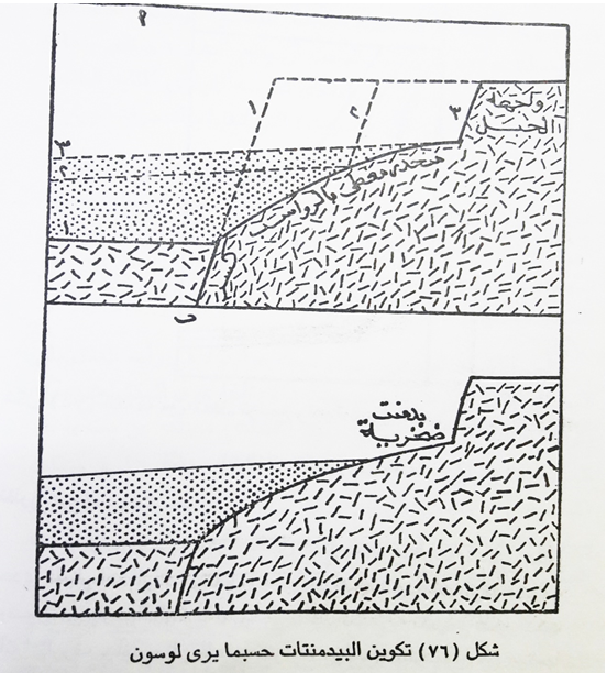 نظرية لوسون: تقدم لوسون A.C.Lawson في عام 1915 بنظريته، التي تعتبر احدى النظريات الرائدة والمقنعة، لتفسير نشأة البيديمنت. وقد افتراض لوسون من الوجهة النظرية، تراجع حافة انكسارية تتعرض للغزو تحت تأثير ظروف جافة. وان الحافة تتراجع بواسطة التجوية من موقعها الاصلي، ويتراكم الفتات الصخري عند حضيض الحافة، مالم تكتسحها وتزيلها المجاري المائية. وبمرور الزمن، قد ينمو الفتات الصخري، ويزحف باستمرار صعدا فوق وجه الحافة المتراجعة، وتبعا لذلك ينمر جزؤها السفلي، وينعزل عن تأثير التجوية. ويستمر الجزء العلوي من الحافة وحده في التراجع، وفي كل مرحلة تراجعه يترك، بطبيعة الحال، كمية أصغر من الفتات الصخري، الذي ينتشر ويتوزع فوق سطح منحدر افتات الصخري.
