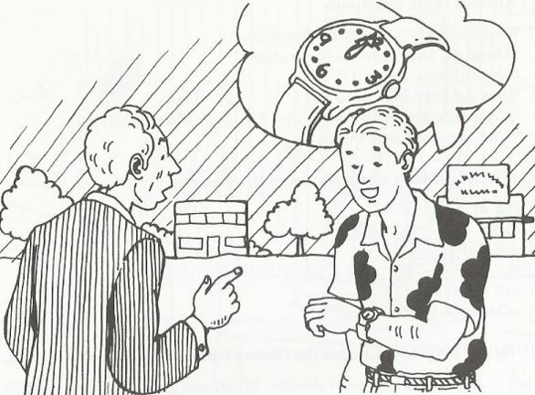 Don was traveling around the country, and one day he was in a hotel in a small town. Lunch was served from twelve-thirty to one-thirty. Don went out for a walk in the morning but he forgot to put on his watch. He walked for a long time, and then he saw a young man in the street, so he said to him, “Excuse me, can you please tell me the time?"