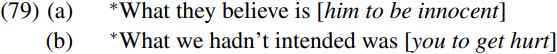 Further evidence that ECM infinitive clauses like those bracketed in (76) are TPs rather than CPs comes from the fact that they cannot occur in focus position in pseudo-clefts, as we see from the ungrammaticality of the sentences below: