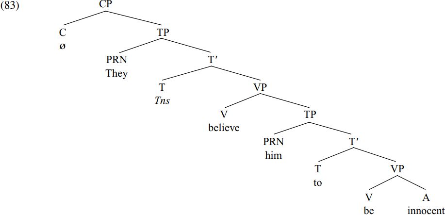 The particular aspect of the analysis in (83) most relevant to our discussion is the claim that the complement clause him to be innocent is an infinitival TP headed by to, and its subject him is assigned accusative case by the transitive verb believe: how this happens.