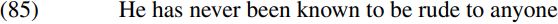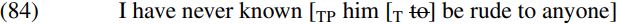 We can extend the analysis of ECM predicates like believe which select a bare infinitive complement. On this view, a sentence like I have never known him be rude to anyone would be analyzed as containing a transitive perfect participle known which selects a TP complement headed by a null counterpart of infinitival to – as shown in skeletal form in (84) below: