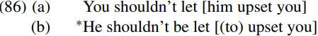 We can’t describe the relevant facts by saying that let is a defective verb which has no passive participle form, since let is used as a passive participle in sentences like The prisoners were let out of jail. An alternative analysis is to suppose that whereas typical ECM predicates select an infinitival TP complement in both active and passive uses, let is irregular in that it only selects an infinitival TP complement in active uses, not when used as a passive participle. Similar lexical idiosyncrasies are found with a number of other verbs: for example, know only allows a bare infinitival complement with an accusative subject when used as a perfect participle in structures like (84) above. (An alternative way of accounting for the impossibility of passivisation in sentences like (86b) which we won’t adopt here is to take let to be a verb selecting a CP complement headed by an inherently null complementizer which in turn selects an infinitival TP complement headed by a null counterpart of infinitival to: the ungrammaticality of (86b) then follows from the impossibility of passivizing the subject of a CP complement.)
