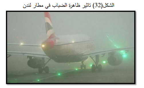 الضباب: يؤثر الضباب على جميع انوع النقل من خلال حجب الرؤية الى اقل من 100 متر، وما تسببه من حوادث بشرية ومادية حيث يؤدي الضباب الكثيف في لندن الى تعطيل حركة السفر على الطرق البرية والسكك الحديدية فضلا عن تعطيل المسافرين في المطارات اغلب ايام الشتاء، مما يؤدي الى الغاء الرحلات من وإلى مطارات هيثرو وجاتويكو سيتي، ولا يقتصر الضباب على لندن بل أشارت منظمة مراقبة الحركة الجوية الأوروبية إلى أن الضباب الكثيف يؤدي إلى تأخر الرحلات في باريس وشتوتغارت وهامبورغ وبرلينول وكسمبورغ وبروكسل، إلا أن بريطانيا كانت الأكثر تأثراً . الشكل (32).