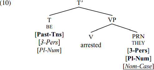 Since all the features carried by BE are now valued, BE can ultimately be spelled out in the phonology as the third-person-plural past-tense form were. Likewise, since all the features carried by THEY are also valued, they can ultimately be spelled out as the third-person-plural nominative form they. However, the derivation in (8) is not yet terminated: the [EPP] feature of T will subsequently trigger A-movement of they to become the structural subject of were, and the resulting TP they were arrested they will then be merged with a null declarative complementizer to form the structure ø they were arrested they: but since our immediate concern is with case and agreement, we skip over these details here.