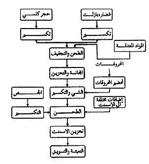 ويتم الحصـول علـى هـذه الخلطـة مـن مـقـالع خاصـة غنية بالمركبـات الأساسية وفي مقدمتها الحجر الكلسي والغضار، ويتألف الحجر الكلسي أساسا من كربونات الكلسيوم CaCO3، ويجب أن تكون نسبتها فيـه بين 75 و100% وذلك بحسب نوعية الحجر الكلسي، وأما الغضار فيحوي السيليس والألومينا وأكسيد الحديد بنسب متفاوتة بحسب الغضار المتوافر، ويمكن استخدام البازلت، وهو صخر بركاني، عوضـاً عـن الغضـار لاحتوائـه عـلـى المركبات المطلوبة، وإن تركيـز هـذه المركبات في الخلطة بنسب محـددة تماماً شرط أساسي للحصول على الاسمنت المرغوب فيه. وهنا يأتي دور المركبات الثانوية، فهي إما أن تكـون مـواد مصححة أو مضافة، والمواد المصححة ضرورية لتعديل نسب المركبات الرئيسة وتصحيحها في حال وجـود نقص أو لإعطاء الاسمنت صفة معينة، فيضاف الرمـل لتعديل نقص السيليس، ويضاف الحديد أو خبث الحديد لتعديل نقص أكسيد الحديد، ويضاف البوكسيت bauxite لتعديل نقص الألومينا وغير ذلك. أما المواد المضافة فتتألف من مواد عضوية أو غير عضوية تضاف إلى الخلطة لتحسين ظروف شيها وتخفيف نسب المواد الفائضة فيهـا وتقليل استهلاك الطاقة، ويأتي في مقدمـة هـذه المواد الكلوريدات والفلوريدات والفوسفات والكبريتات وغيرها . التكسير والطحن والمجانسة: يشترط قبـل شـي الخلطة في الأفران أن تكون جيدة الخلط وعلى هيئة ذرات ناعمة، ويتم الخلط في الطريق بين المقالع التي تأتي منهـا المـواد الأوليـة وأفـران الـحـرق. إذ يتم استخراج الخامـات بـالتفجير والحفـر بوساطة الحفارات والجرافات، ثـم تنـقـل على سيور ناقلة أو في عربات كهربائية أو قطارات خاصة إلى أماكن التكسير والطحن، فتلتقمها كسارات ضخمة تصمم وفقاً للخواص الفيزيائية والميكانيكية لتلك المواد، وهـي إما أن تكون ذات مطارق أو ذات فكين أحدهما ثابـت والأخـر مـتحـرك، أو أسطوانية أو مخروطيـة فيهـا كـرات وكتل حديدية تسحق ما بداخلها. مخطط صنع الاسمنت بالطريقة الجافة والطريقة الرطبة , ففي الطريقة الجافة تطحن المواد الهشة من دون تكسير أو تهشيم أولي، وقد يتطلب بعض المواد القاسية كالبازلت والمرمر وبعض أنواع الصخور الكلسية تهشيماً مبدئياً قبل إدخالها المطحنة، ويتم في أثناء الطحن خلط الخامات خلطاً جيداً ونهائيا. وقـد يبـدأ الخلـط مـن المقلـع ويستمر مـع مـرور المواد الخام في الكسارات فالمطاحن.