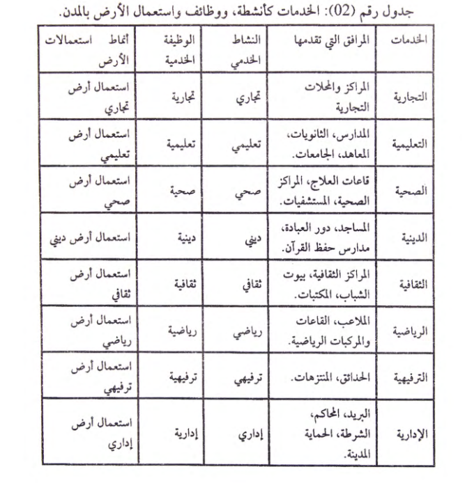 فالخدمات التعليمية تقدم من طرف المدارس والثانويات والمعاهد والجامعات والتي هي بمثابة مرافق متخصصة في تقديم الخدمات التعليمية وعليه فالخدمة التعليمية هي نشاط ووظيفة تؤديها هذه المرافق التي تشغل حيزا مساحيا يمثل استعمال الأرض التعليمي، ونفس الشيء بالنسبة لجميع الخدمات الحضرية الأخرى والموضحة في الجدول رقم 02
