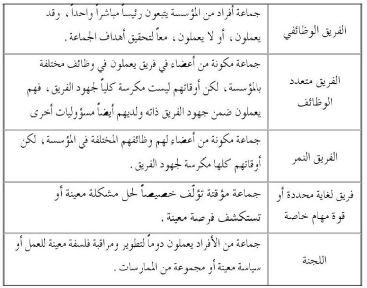 ليست الفرق جميعاً متشابهة حين يتعلق الأمر بطريقة تكوينها أو بالمطالب التي تقتضيها من أعضاء الفريق. وإذا أردنا مزيداً من التعقيد والتفاصيل يمكن القول: ليست كل جماعة توصف ب «الفريق» فريقاً بكل ما في الكلمة من معنى، وهنالك جماعات أخرى تدعى بأسماء مختلفة، وتقوم أحياناً بعمل فريقي مذهل يدعو للإعجاب. وقد أثبتنا في الصفحة التالية لائحة مختصرة تبين بعضاً من نماذج الفرق التي نجدها في المؤسسات.