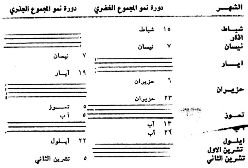يبدو من هذا الجدول التخطيطي أن نمو المجموع الخضري يتبادل مع نمو الجذور وان الفترات التي ينشط فيها نمو المجموع الخضري يتوقف فيها نمو الجذور والعكس صحيح، كما يتضح أن هناك ثلاثة دورات لكل من نمو المجموع الخضري والجذري. ولا شك بأن فترات الري أو سقوط الامطار وما بينها لها أثر على فترات النمو والركود بالنسبة للجذور والسوق.
