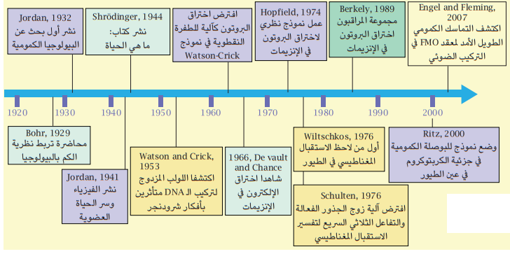 شكل 1-3: خط الزمن للمعالم المفتاحية في تطور البيولوجيا الكمومية خلال القرن العشرين وبداية القرن الحادي والعشرين. محور عن McFadden & AL-Khalili (2018) الاشكال الرباعية تشير الى مراجع.