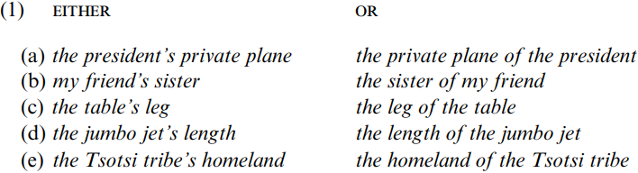 When a possessor is a noun phrase (which can be just a noun) there are, in fact, two ways of marking it—by suffix ’s on the possessor (which precedes the possessed) or by the preposition of before the possessor (which follows the possessed). One can say: