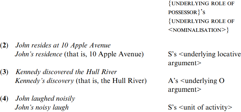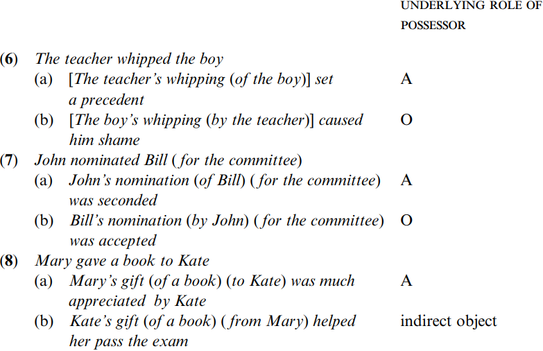 English has a rich range of derivational processes which form a nominal from a verb—these are nominalizations, and they have a close link with possession. A noun phrase which is in S, A, O or indirect object function to a verb may become possessor of a nominalization based on that verb. For example: