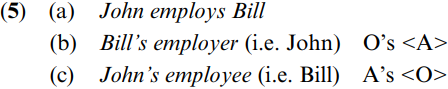 It will be seen that a nominalization can refer to one of a number of aspects of the basic sentences it is associated with—employer in (5b) is a volitional agent; discovery in (3), employee in (5c) and gift in (8) are all underlying objects; and residence in (2) is a locus. In contrast, whipping in (6) refers to an activity, while laugh in (4) and nomination in (7) refer to a unit of activity.