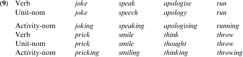 It will be seen that a Unit-nom can have the same form as the verb, or a different form (as in speech, apology, and thought). Activity-nom’s typically end in -ing, although there are other possibilities (for example, resistance, recovery).