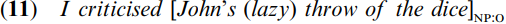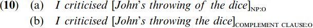 The object argument of (10a) is a noun phrase with the nominalization throwing as head, whereas the object of (10b) is the complement clause John’s throwing the dice. There is a difference in meaning, with (10b) stating that I criticized the fact that he threw the dice, while (10a) states that I criticized the way in which he threw them.
