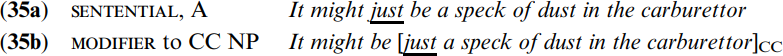 This is ambiguous between the two parsings (with distinct meanings)—one having just as sentential adverb in A position, and the other having just as modifier within the NP in copula complement function. In spoken language, the two senses of (36) may be distinguishable by stress going on just for the sentential meaning, as in (35a), and on dust in the modifier-to-CC sense, as in (35b). (Note that an NP modified by just may have other functions besides copula complement; for example, [Just a speck of dust in the carburettor] caused all that trouble.)