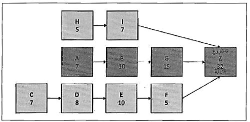 المشروع الظاهر في الشكل (1) يحتوي على تسعة أنشطة متبقية. يبرز المسار الحرج باللون الغامق. يتوقع المشروع حالياً أن ينتهي خلال 32 يـوم. وجه مالك المشروع المقاول لتسريع العمل لينتهي المشروع خلال 25 يوم. وبالتالي، على المقاول أن يقصر المدة الزمنية الكلية 7 أيام.