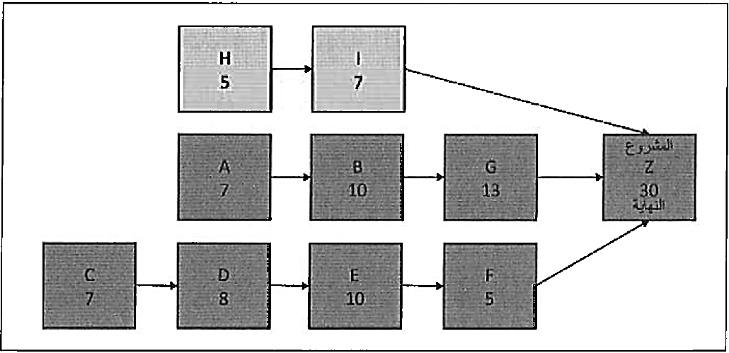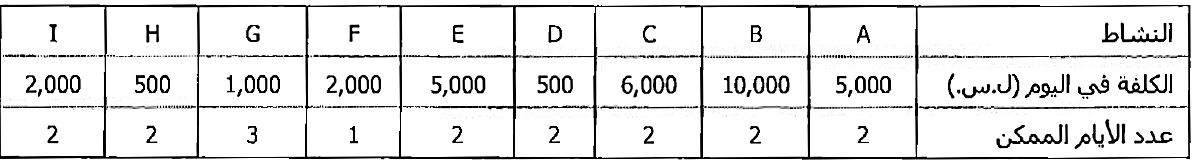 وبالتالي، بعد اليوم الثاني من تسريع العمل ، كـان مـن الضروري تسريع العمل في كـل مـن المسار الذي يبدأ بالنشاط A والمسار الذي يبدأ بالنشاط C لتحسين تاريخ النهاية. الأنشطة التي سرعنا فيهـا العمل والكلفة المتعلقة بتنفيذ ذلك التسريع ملخصة في الجدول التالي. حيث يمكننا أن نرى أن الكلفة الكلية لتسريع العمل في المشروع مدة 7 أيام قد بلغت 46,000 ل.س.
