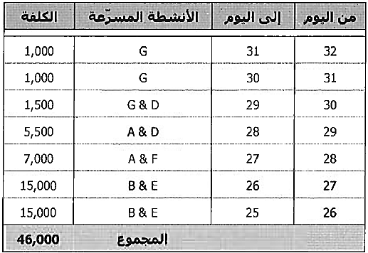 يظهر الجدول التالي الكلفة الاضافية (ميل الكلفة) وعدد الايام الاعظمي لتسريع العمل في الانشطة بشكل معقول .