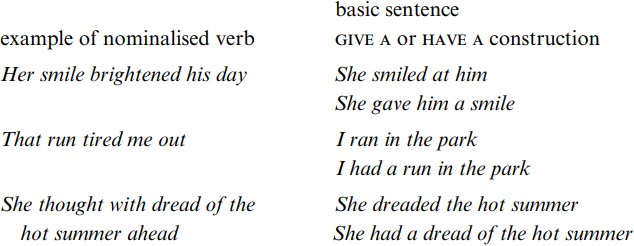 We will also discuss the syntax of HAVE A, GIVE A and TAKE A constructions. To anticipate: if HAVE A or TAKE A relates to a basic sentence that is transitive, the preposition of is likely to be inserted before the erstwhile direct object, e.g. I smelt the pudding and its periphrastic correspondent I had a smell of the pudding. GIVE A may relate to an intransitive basic sentence including a prepositional NP, with the preposition being omitted in the GIVE A construction, e.g. Mary winked at John, Mary gave John a wink.