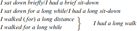 Walk enters into HAVE A constructions (e.g. Why don’t we have a little walk before breakfast?). But it is also an independent noun, as in That walk tired me and I had a tiring walk; the fact that the last sentence is Experiencer have and not the HAVE A construction is seen from the failure of the adverb/ adjective criterion (*I walked tiringly is scarcely felicitous). He had a fall is also an instance of Experiencer have; any one of an array of adjectives may be included in the NP (e.g. nasty, awful, serious), but for most of these there is no corresponding adverb that could be used with I fell.
