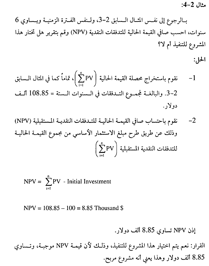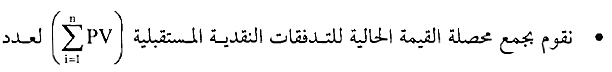 • بعدها يتم طرح مبلغ الاستثمار الأساسي من مجموع القيمة الحالية للتدفقات المستقبلية، والناتج يسمى صافي القيمة الحالية (Net Present Value (NPV