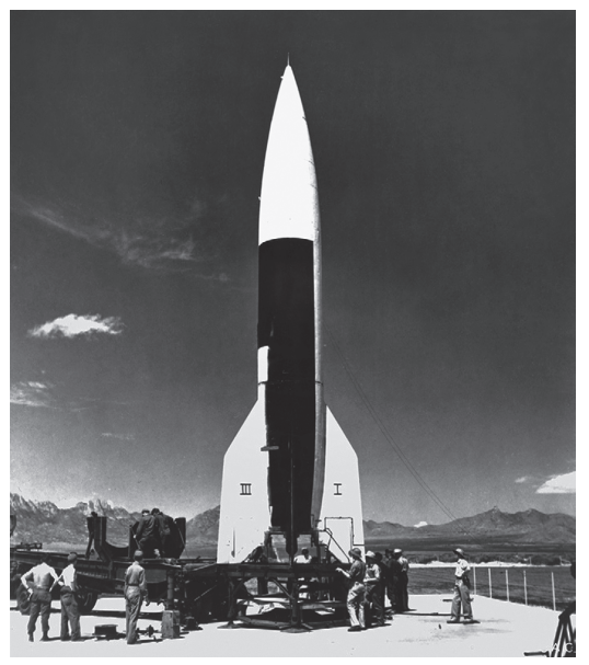 شكل 2-1: جنود وفنيون أمريكان يجهزون صاروخًا ألمانيا باليستيا من نوع «في-2» للإطلاق في وايت ساندس في 10 مايو 1946. أول إطلاق ناجح في الولايات المتحدة. لم يكن صاروخ «في-2» سلاحًا شديد الفاعلية، ولكنَّه كان إنجازا ثوريا في تكنولوجيا الصواريخ ذات الوقود السائل التي سرعت ظهور الصاروخ الباليستي العابر للقارات وصاروخ الفضاء (المصدر: إدارة الأرشيف والوثائق الوطنية).