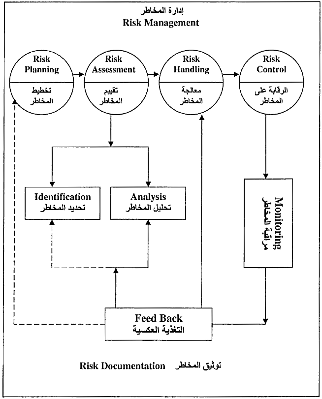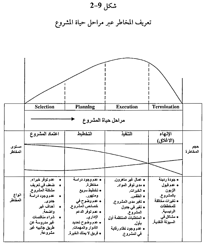 أ. تعريف المخاطر Risk Identifying عن طريق تحديد أنواع المخاطر التي تواجه المشروع في كل مرحلة من مراحل عمله وقد تم تلخيص هذه المخاطر وبلورتها في الشكل 9-2 .