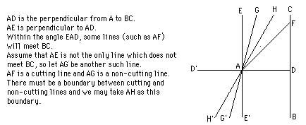 All straight lines which in a plane go out from a point can, with reference to a given straight line in the same plane, be divided into two classes - into cutting and non-cutting. The boundary lines of the one and the other class of those lines will be called parallel to the given line.