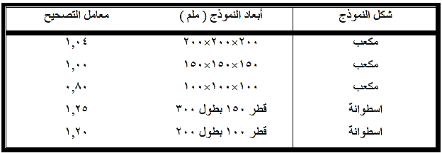 معامل التصحيح للنماذج الخرسانية مختلفة الاشكال والابعاد والمستعملة لفحص مقاومة الانضغاط