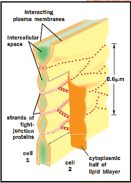 A model of a tight junction. It is thought that the strands that hold adjacent plasma membranes together are formed by continuous strands of transmembrane junctional proteins across the intercellular space, creating a seal.