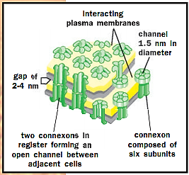 In contrast to the tight junction, there is a channel between the membranes of contacting cells in the gap junction so that the cytoplasm of the two is connected. The basic building block of each gap junction is the connexin subunit. Six of these in each of the membranes of two neighboring cells come together, and then the group of six connexins in one cell interacts with a comparable hexamer in the other cell resulting in the formation of a channel. This channel allows direct cytoplasmic communication among the cells; small molecules of 1,500 Daltons or less can pass through the channel of each gap junction whose opening or closing can be controlled locally in the cell. Gap junctions unite muscle cells in the heart to help coordinate their contraction.