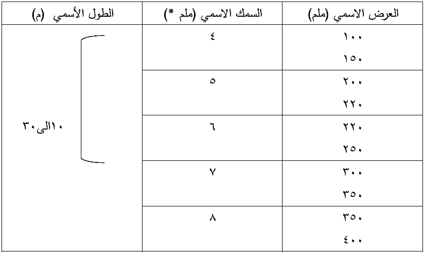 تكون ابعاد مواد الاحكام من البولي فينيل كما في الجدول رقم ( 8-7 ) :