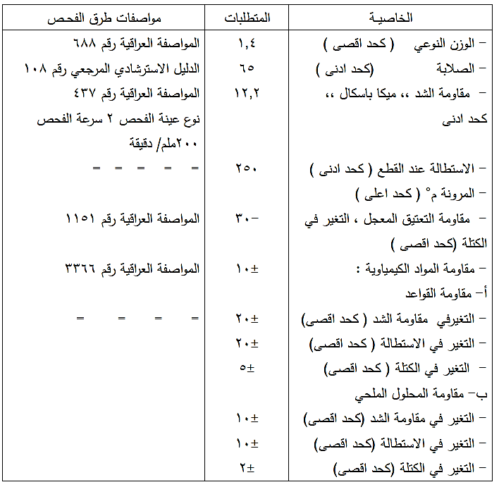 تطابق خواص مواد احكام البناء المتطلبات الواردة في المواصفة القياسية العراقية ( رقم 3366 ) وكما مبين في الجدول رقم ( 8-9 ) .
