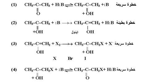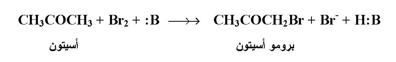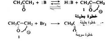 وبهذا فإن الدراسات الحركية تتفق مع الميكانيكية التالية لتفاعل البروم مع الأسيتون المحفز بقاعدة . حيث تتضمن الخطوة الأولى ، وتعتبر هي الخطوة المحددة لسرعة التفاعل أو ما يسمى بالخطوة الضابطة للتفاعل، وفيها يكون السحب البطئ للبروتون من جزيئة الأسيتون لتكوين الأنيون الكاربوني (1) .