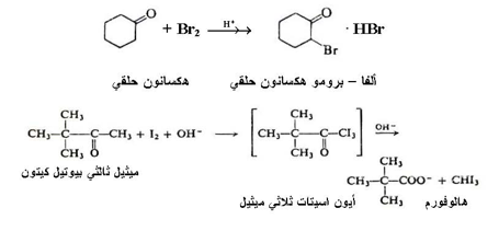وحين يتكون الاينول في الخطوة الثانية فإنه يتفاعل بسرعة مع الهالوجين كما في الخطوة الثالثة ، أما الخطوة الأخيرة فهي ببساطة فقدان البروتون المكتسب لتكوين الناتج النهائي . وفيما يلي بعض الأمثلة على هلجنة الكيتونات المختلفة .