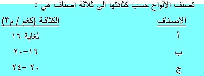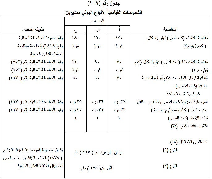 تكون خواص الالواح مطابقة لمتطلبات المواصفة القياسية العراقية رقم (1171) وكما مبين في الجدول رقم (9-9)