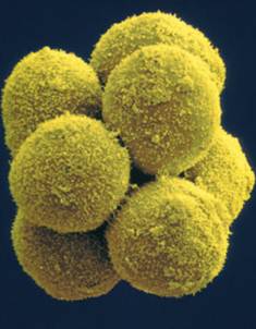 A scanning electron micrograph of a human embryo at the eight-cell stage (day three).