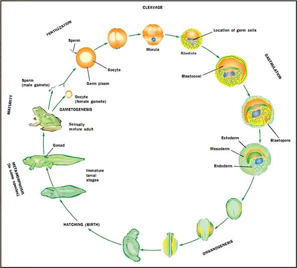 Figure 2. Developmental history of the frog. The stages from fertilization through hatching are known collectively as embryogenesis.