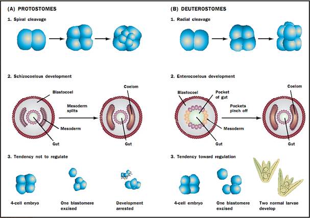 Protostomes exhibit spiral cleavage in which the blastomeres divide at acute angles to one another and are not aligned over one another. If one of these blastomeres is removed from the embryo, neither the removed blastomere nor the remaining cells develop into an individual. This type of determinate cleavage indicates that the fate of the daughter cells is determined early in development. A final characteristic of protostomes is that the body cavity, or coelom, develops as a split within the middle of the mesodermal layer. This type of coelom formation is termed schizocoelous development.