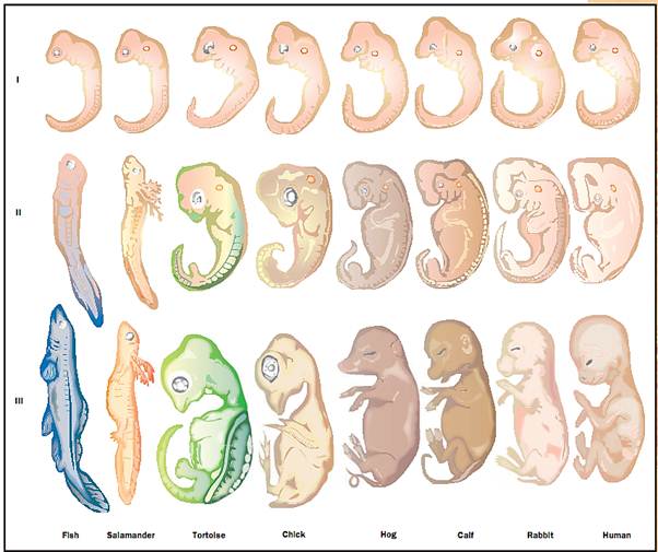 Modern scientists do not subscribe to the biogenetic law as postulated by Haeckel. However, there are elements of recapitulation that are important in comparative embryology. In 1828, Karl von Baer pointed out that vertebrates share common characteristics during development (see Fig. 3). Examination of vertebrate embryos reveals that during corresponding stages of early development, the embryos appear to be very similar. For example, all vertebrate embryos pass through stages in which they have gill pouches. The pouches eventually develop into the gill apparatus in fish; in later-evolving vertebrates that do not have gills, the gill pouches undergo further refinement and develop into structures associated with the head and neck. Similarly, all early vertebrate embryos have tails, which persist in some animals but regress during the later stages of development of humans. Thus, the individual development of an animal occurs through a series of stages that paint a broad picture of the evolutionary stages (phylogeny) of the species to which it belongs.