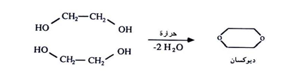 وعند تسخين جزئيي جليكول ايثلين مع حمض الكبريتيك المركز يتكون ديوكسان ( مذيب صناعي مهم ) :