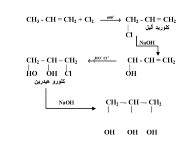 ويحضر الجليسرول حالياً وبطريقة تجارية من هلجنة البروبين عند درجة حرارة مرتفعة ليعطي كلوريد أليل كناتج أولي الذي يتفاعل مع هيدروكسيد الصوديوم ثم مع حمض هيبوكلوروز ليتكون كلوروهيدرين وهذا بدوره يتفاعل مع هيدروكسيد الصوديوم المائي ليعطي الجليسرول كما يلي :