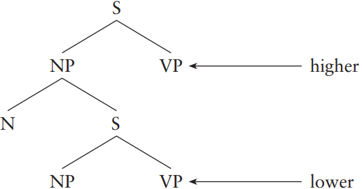 A term used in GENERATIVE GRAMMAR to refer to a CATEGORY which is introduced earlier than a further instance of the same category in a TREE-diagram representation. The first instance of the category is seen to be higher up the tree than the other instance(s). For example, in such sentences as the idea that the man will resign surprises me, the following (partial) tree might be used: