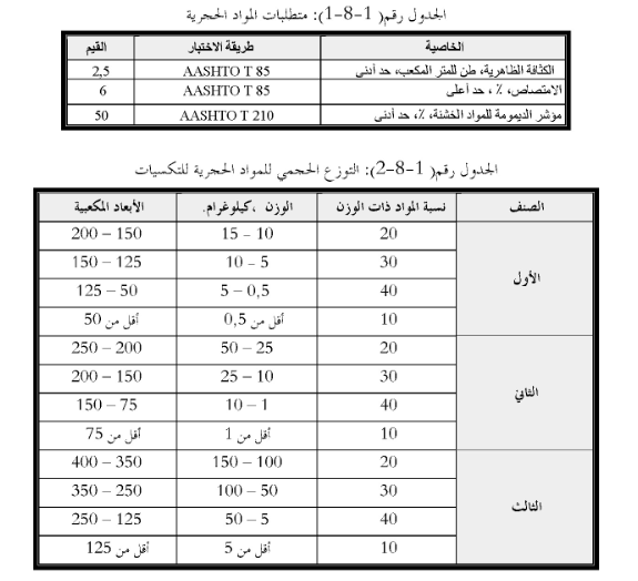 تحقق مواد التكسية الحجرية المفككة او المربوطة بالمونة متطلبات التوزع الحجمي المبينة في المواصفات الخاصة و وثائق العقد او احد التوزيعات المبينة في الجدول رقم (1-8-2)، ويجب الا يقل البعد الاصغر للحجر عن 20سم او ثلث (1/3) بعده الاقصى ايهما اكبر ، يجب ان تكون المواد من الحجارة ذات الزوايا لتامين الاحتكاك الكافي بين الأحجار.