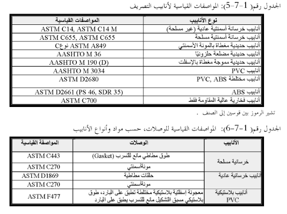 واقطار الانابيب والعناصر المستخدمة تعليمات الجهات المصنعة للأنابيب كما يجب ما لم تنص المواصفات ومع الخاصة ووثائق العقد على خلاف ذلك ان تحقق متطلبات المواصفات القياسية المبينة في الجدول رقم (1-7-6).