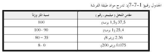يجب ان تحقق طبقة الفرشة تحت تمديدات الانابيب متطلبات التدرج المبينة في الجدول رقم (1-7-7)، ما لم تنص المواصفات الخاصة على خلاف ذلك، ويجب الا يزيد مؤشر لدونة مواد طبقة الفرشة لكافة انواع الانابيب على ثمانية ( 8 ) بموجب اختبار 190 AASHTO .