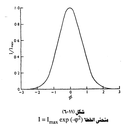 ويسمى منحني الخطأ error curve حيث I هي شدة الأشعة المقاسة عند زاوية انحراف φ من القيمة الحقيقية للكميات θ، α هي كمية ثابتة وهذه الدالة الموضحة بشكل (11-6) اختيرت لأن لها القيمة العظمى عند = zero φ وتقل إلى الصفر كلما ازدادت قيمة φ، كما أنه في طريقة إثبات العلاقة السابقة يفترض أن عناصر الانعكاسات (elements of broadening) لها أيضا هذا الشكل.